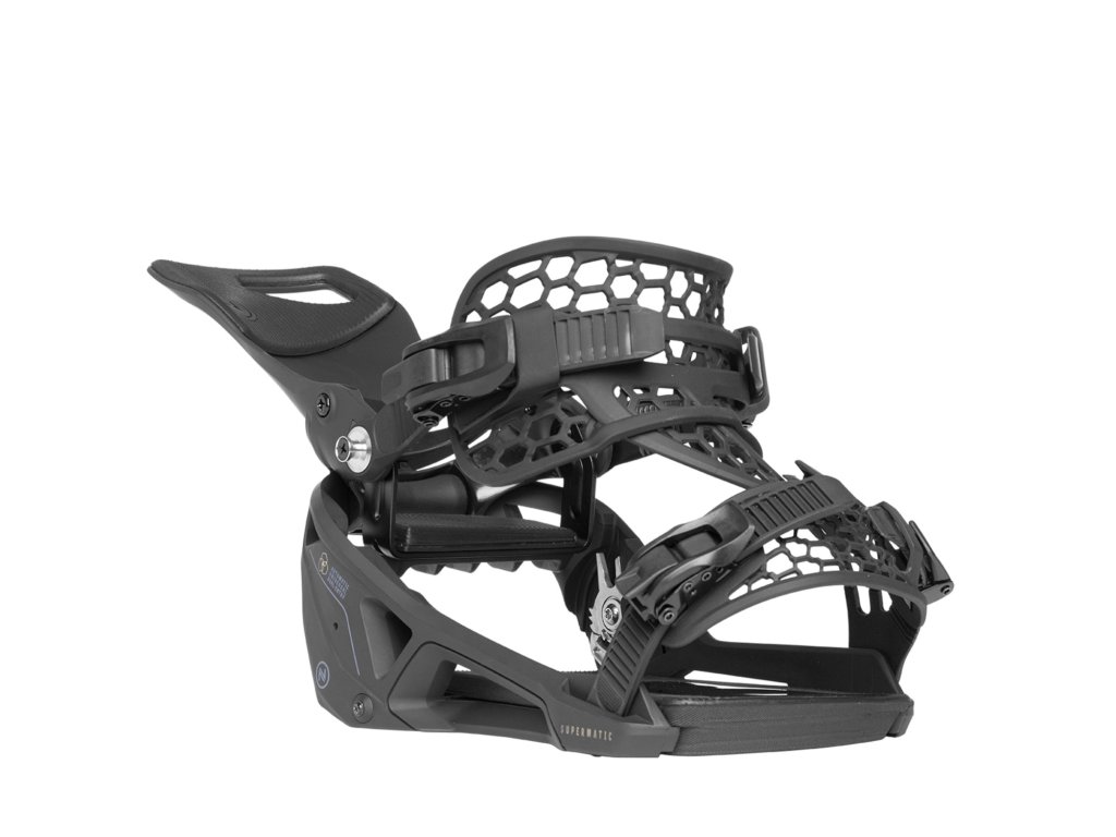 Systém Supermatic je vyroben z osvědčených materiálů, které najdeš v celé modelové řadě Nidecker. Zbrusu nový baseplate je vyroben z odolného nylonu vyztuženého sklolaminátem s deskou Slip-N-Grip, která pomáhá špičce klouzat po podložce a ještě více usnadňuje nástup. V zadní části je umístěn váleček pro hladký chod spouštěče hibacku. A konečně, nylonový hiback Asym Hadron je navržen tak, aby perfektně seděl, s citlivou flexí a integrovaným regulátorem předklonu pro úplné přizpůsobení.